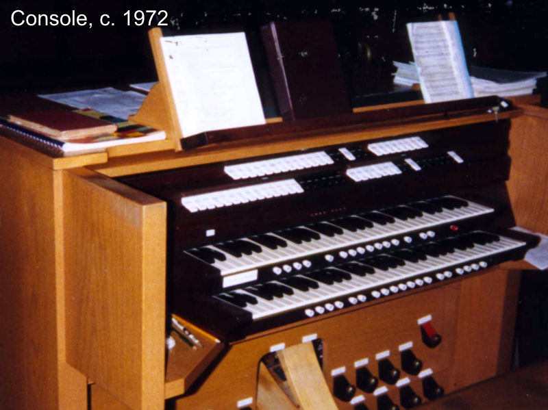 By 1960, the congregation had decided to raze the building on Main Street and build a new church building on Western Avenue. Loving the sound of their beloved pipe organ, the congregation decided to take the pipes with them to the new church. They would have new windchests, bellows, and a console built for the new space. In 1962, the pipes were removed, relocated, and revoiced on the new windchests for the current church building by the former Berkshire Organ Company, Inc. of West Springfield, Massachusetts. It is believed that the Spencer blower was also moved. A "floating" Positiv Division was created, separating some ranks (sets of pipes) that were originally part of the Swell Division and adding a couple new voices. The former case was dismembered and along with the console were disposed of. The console that Berkshire installed, along with much of the organ itself, was continuously plagued by various problems. It became evident to the church that Berkshire's work was of substandard quality and had to be dealt with. A new company was contacted. Austin Organs, Inc. of Hartford, Connecticut began work on the organ in 1972. Although they were asked to bid on the relocation of the organ in 1960, they lost to Berkshire. They installed a new console (present), substantially improved the Great Division by installing a new Austin "universal" windchest, replacing the pipes for the 8' Principal, 4' Octave, 2' Fifteenth, III Mixture, and 8' Bourdon, and re-voiced the pipes for the 8' Dulciana, and the 4' Holz Flute. The re-voiced pipes are believed to be from the original Johnson organ. In addition, they installed the 4' Pedal Choral Bass on the Great windchest. Some of these pipes are also from the Johnson organ. This work cost $18,950.00! What a bargain!