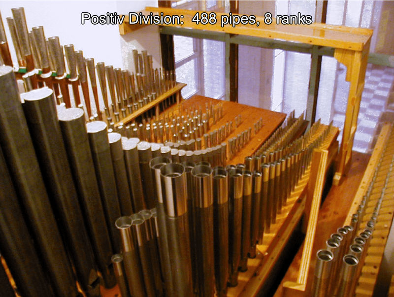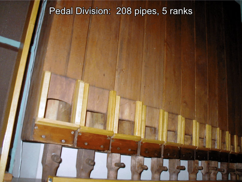 In the Positiv Division, they installed a new wind regulator, installed a new Inertia tremolo device, rebuilt the former Ventil Electro-pneumatic action windchests as unit electro-pneumatic action and added rebuilt unit-valve windchests for other stops. The ranks of the 8' Gedeckt Pommer, 4' Nachthorn, and the 2' Blockflute were revoiced by Czelusniak et Dugal. The 1 1/3' Larigot (Geisecke) and the 8' Krummhorn (A. R. SchoppÕs Sons) were replaced with new pipework. The Sesquialtera II (Glastonbury, CT.), and the 8' Trompete (revoiced from the Swell rank) were added to the division. With these additions, the Swell 8' Hautbois was no longer keyed to the Positiv. The 8' Gedeckt Pommer, 4' Nachthorn, and the 8' Krummhorn ranks stand upon the rebuilt as unit electro-pneumatic Ventil Electro-pneumatic windchest, the 8' Trompete stands upon the overhauled Berkshire chest that it stood on in the Swell, the II Sesquialtera and the 2' Blockflute stand on the unit electric chest original to the Sesquialtera when it was in Glastonbury, CT. (a 12-note bass chest with Austin actions, recycled from our Swell division, was also added to allow the II Sesquialtera to speak to bottom C. New pipes were added for this bass section). The 1 1/3' Larigot speaks on a rebuilt unit electric chest that is original to the Positiv. Also included in this project were new wind lines for the Swell and Positiv from the main supply to the regulators, a new digital clock for the console, and reactivation of the Organist Alert Signal. The total cost of this work was $96,600.00 and was completed on November 3, 2005.